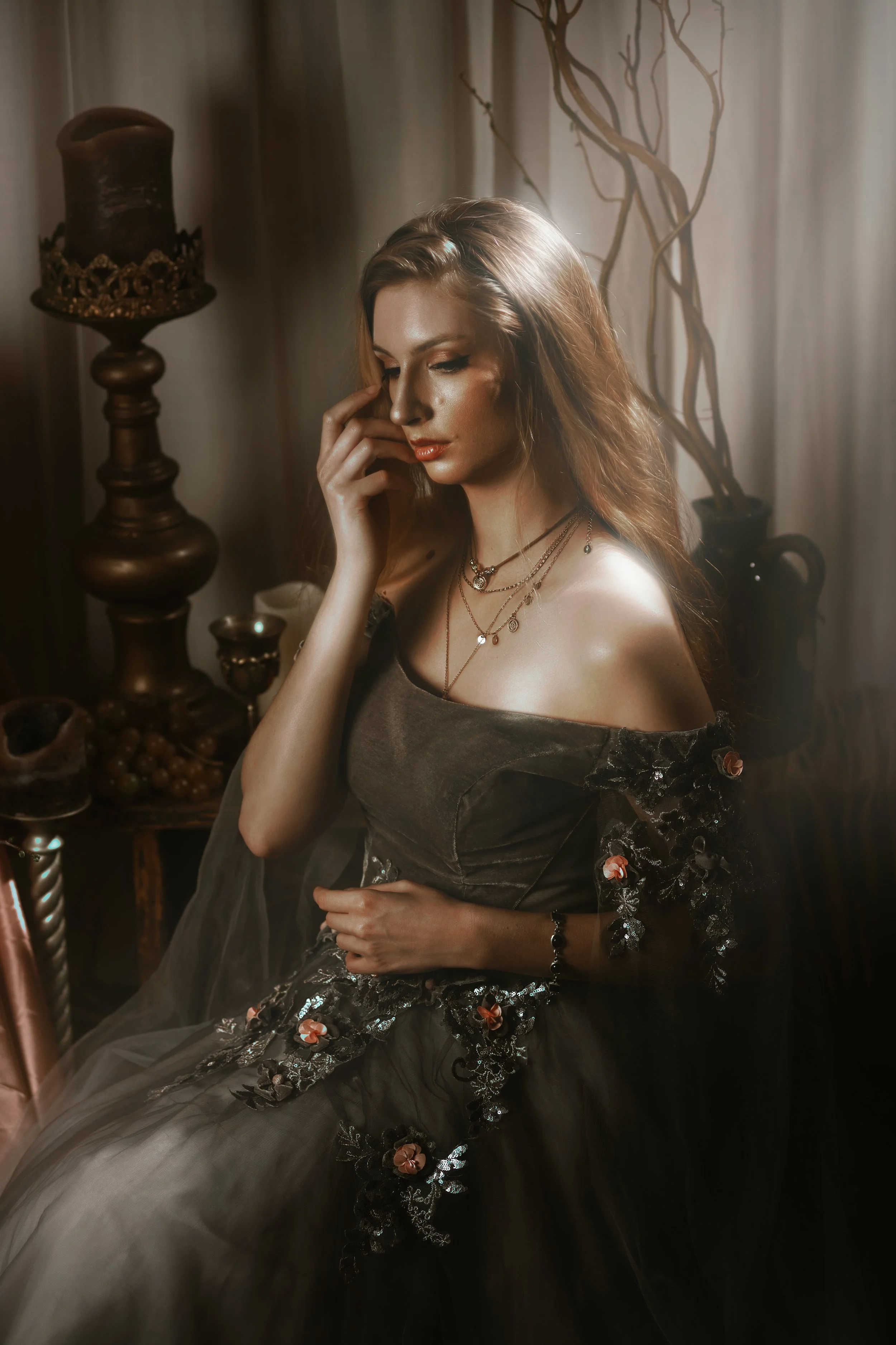 Een fine art portretserie van Kim en Sunray in een donker romantische setting met kaarslicht, sieraden en rijke stoffen. Een verhalende sfeer geïnspireerd door fantasy, historische portretten en subtiele gothic invloeden.