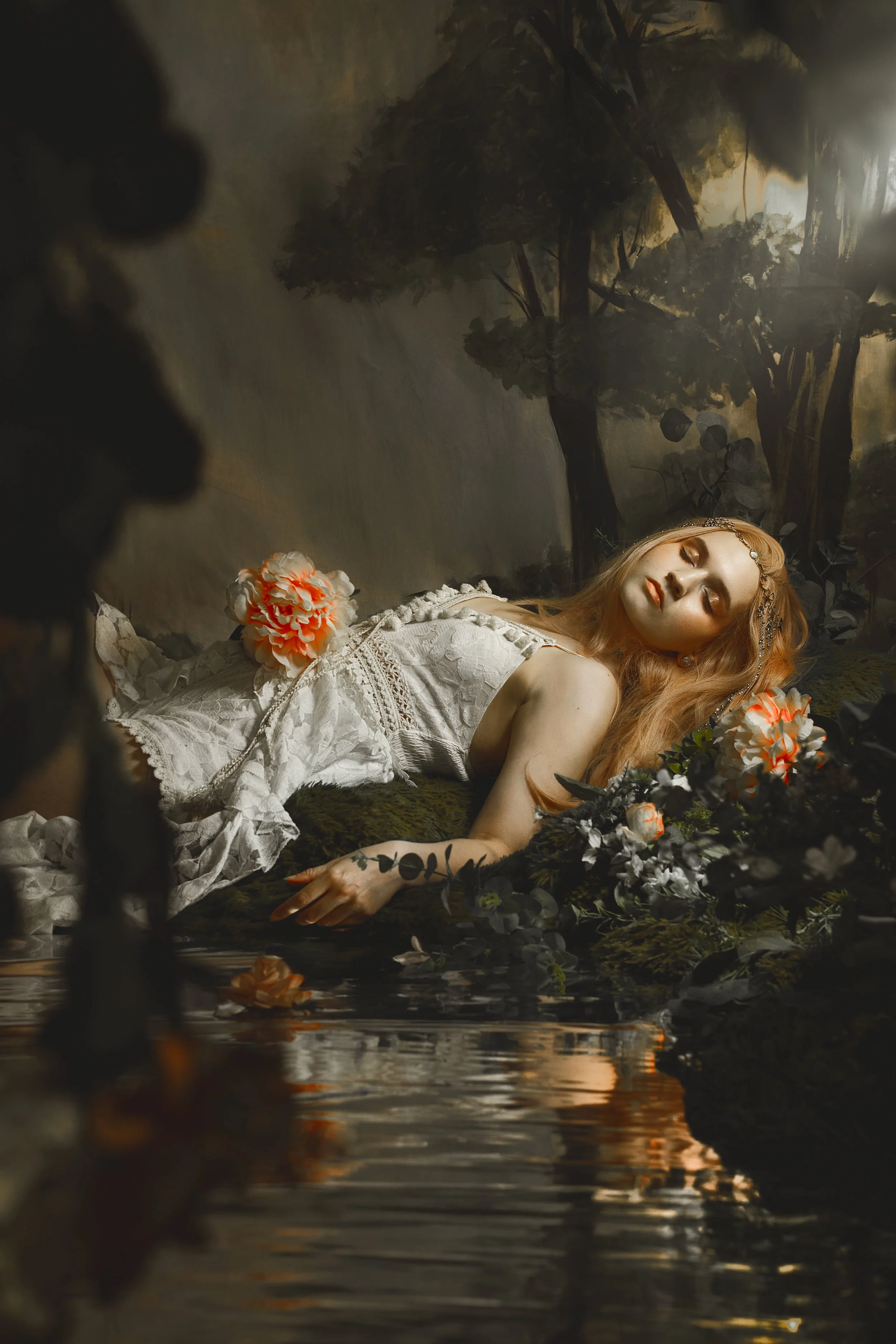 Een fine art groepsserie waarin Neesha, Simone, Rebecca en Shannon elk een eigen moment in hetzelfde dromerige waterlandschap bewonen. Bloemen, reflecties en zacht licht creëren een schilderachtige sfeer geïnspireerd door klassieke kunst, folklore en verstilde storytelling.